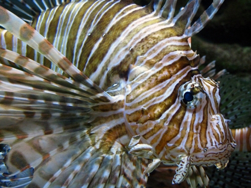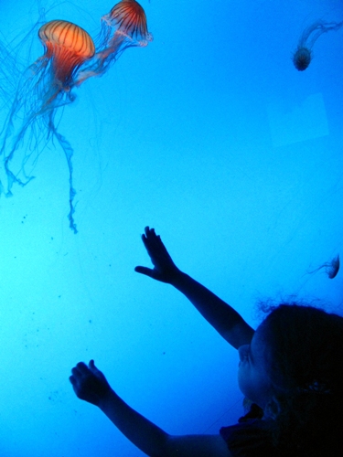A lionfish. They are beautiful as can be, but exotic to the Georgia coast and tearing it up. They have no predators so we need to start eating them. One of the aquarium's better small exhibits in my honest opinion.The coral reef section's big finish.A gorgeous weedy scorpion fish. Great camouflage for surprising and stinging its prey.My daughter attempts to bag a pacific nettle jellyfish. I'm glad their affections couldn't be exchanged.A whale shark (the largest fish in the world) in what I think is the biggest aquarium tank in the world. It's really spectacular. If ever there was a claim that captivity paid off in its educational and emotional value--this is it. But you also can't help being incredibly sad for all of the souls inside.