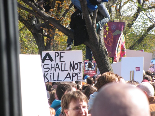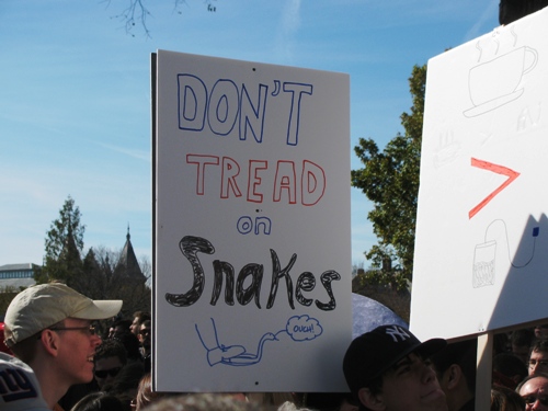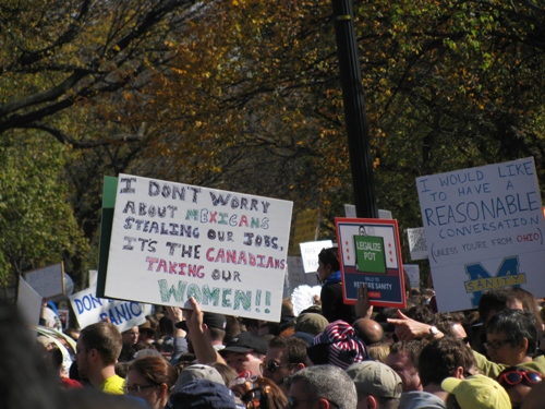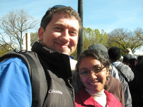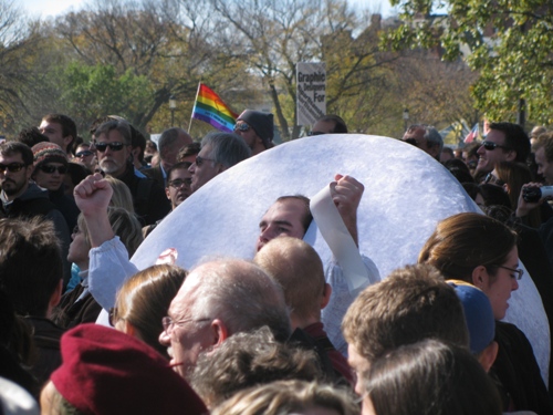 So what was good? It’s always fascinating to see a big crowd and people excited. The jammed-up-tight Metro ride had its own sort of intrigue and excitement as we and countless others had other body parts squished against the train cars’ walls to get to the rally. As the cliche goes, excitement was in the air and people were feeling good. Early tallies suggest that the rally attracted around 150,000 people and the photo below would seem to confirm that number and suggest that there were in fact many more attendees. I must admit that I was surprised by how the racial diversity at the rally was low. It was mostly white people, which for the D.C. area is not very representative of the diversity of people here.